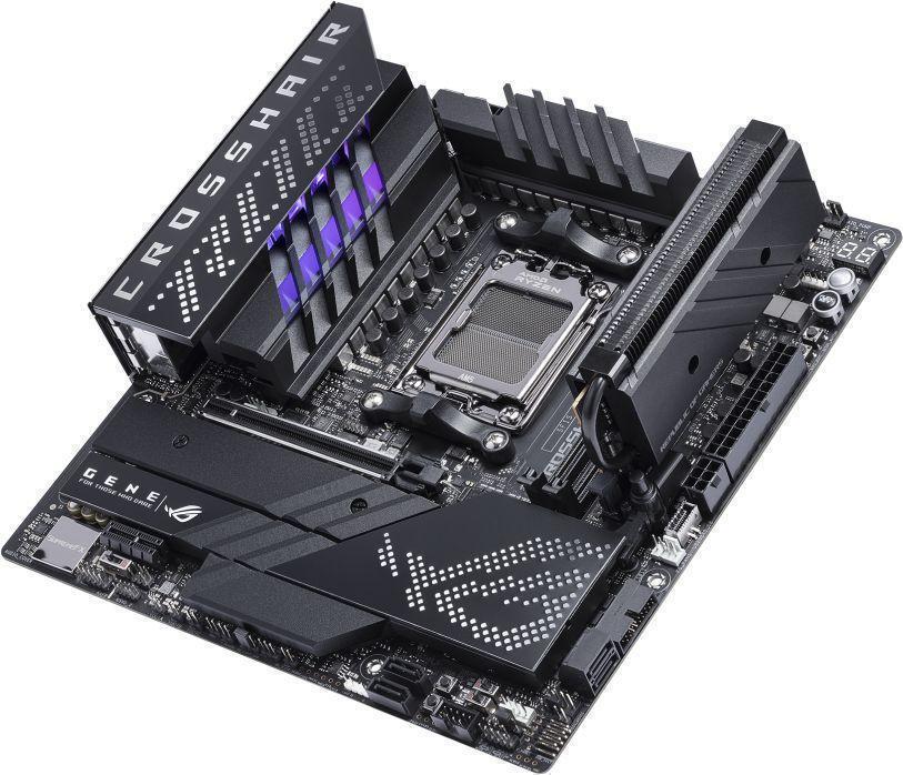 ASUS ROG Crosshair X670E Gene — это флагманская mATX-плата премиум-класса для энтузиастов, сочетающая компактность с топовыми характеристиками. Разработана для AMD Ryzen 9000/8000/7000 серий с 16+2 фазами питания (110A DrMOS), которые обеспечивают стабильный разгон даже Ryzen 9 9950X3D. Полная поддержка PCIe 5.0 (x16 + M.2), DDR5 с AMD EXPO и QVL до 8000+ МГц. Встроенный модуль WiFi 6E и 2.5G LAN для минимальных задержек. Дизайн с черным PCB, алюминиевыми радиаторами и RGB-подсветкой подчеркивает статус ROG Crosshair.
